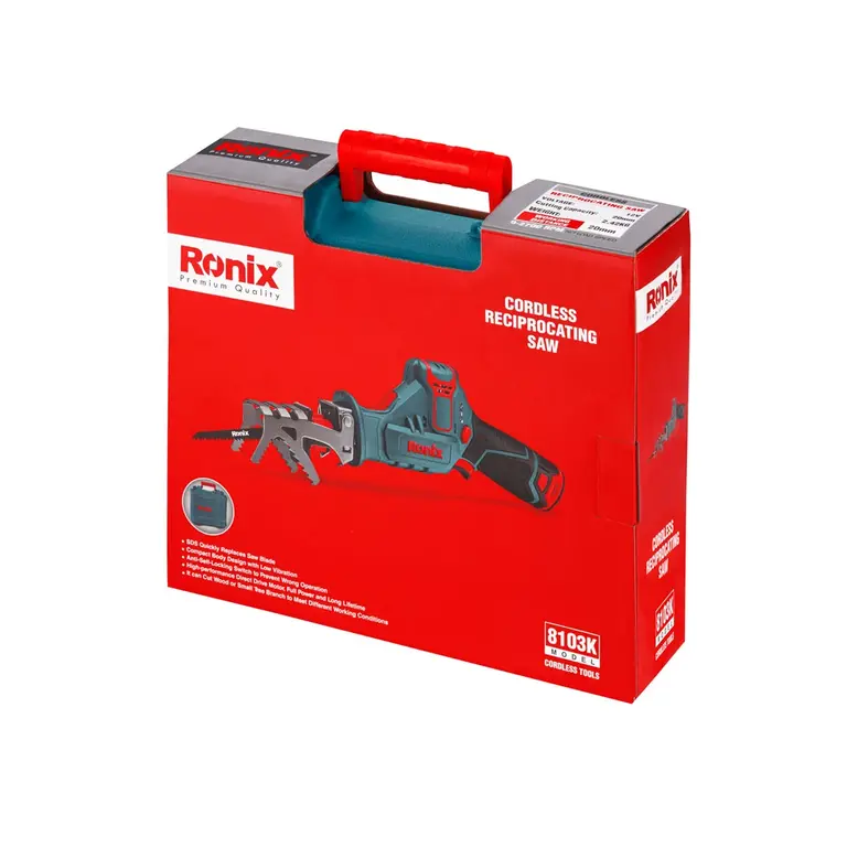 کیت اره افقی بر شارژی 12 ولت مدل 8103K رونیکس، یکی از محصولات All In One و پرکاربرد در سری 81 رونیکس بوده و از آن برای ایجاد برشهای صاف یا منحنیشکل در سطوح چوبی، فلزی، لولههای PVC، مواد و مصالح ساختمانی استفاده میشود. در این اره شارژی، برشهای افقی با حرکت رفت و برگشتی تیغه انجام میشود. ساختار کلی این دستگاه بسیار شبیه به اره عمودبر بوده و تنها تفاوت آن با اره عمودبر، در زاویهی برش و روش در دست گرفتن دستگاه است.