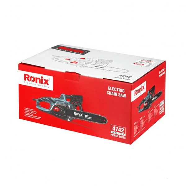 درت برش اره دستی یا تبر برای برش یا قطعه کردن تنه درخت، بسیار پایین است. در واقع بهتر است برای افزایش سرعت و دقت در برش و قطعه کردن چوب، از اره برقی استفاده شود. اره زنجیری برقی رونیکس مدل 4742 توسط برند رونیکس به بازار عرضه شده که میتوان گفت این برند در صنعت ابزار، یکی از برندهای معتبر و محبوب بوده و دارای تنوع بالایی در تولید و عرضهی ابزار فنی است. اره زنجیری برقی رونیکس مدل 4742 دارای دسته محافظ بوده که کنترل را برای برش بیشتر کرده و همچنین سیستم قطع کن و سیستم ترمز اضطراری نیز از موتور و سایر شرایط بحرانی که ممکن است پیش آید، محافظت خواهد کرد. ایمنی اره زنجیری به علت دستگاه با قدرت بالا از نکاتی است که باید حتما رعایت شود. این اره طول ریلی معادل 40 سانتیمتر دارد و سرعت حرکت آن برای برش تنه های بزرگ درختان مناسب خواهد بود.