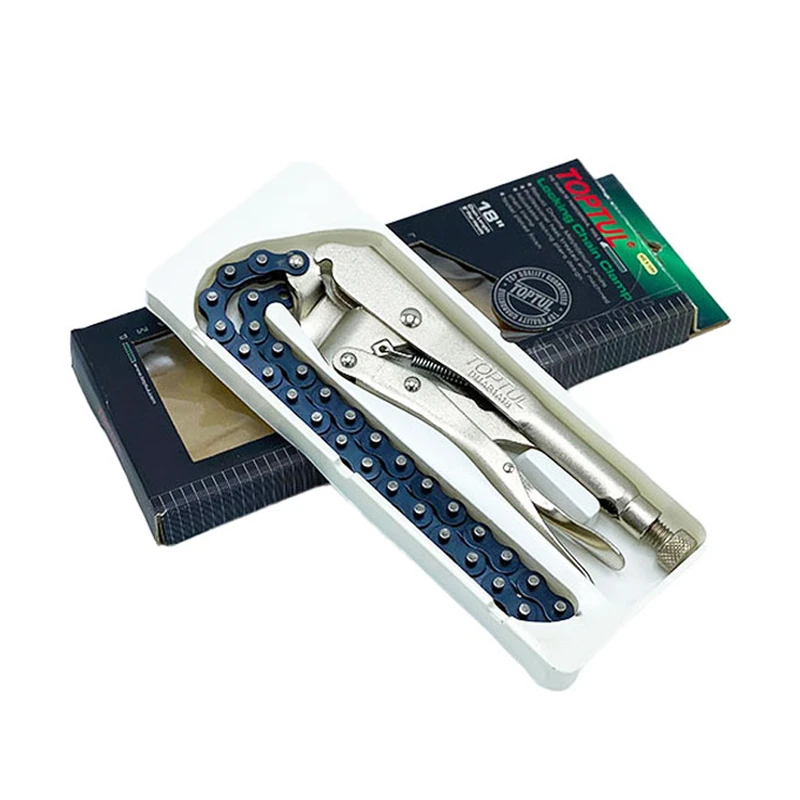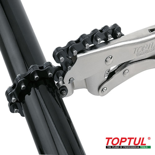 انبرقفلی زنجیری یکی از انواع مختلف انبرقفلی ها به شمار می رود با این تفاوت که در این نوع، از زنجیر فولادی به عنوان فک های انبرقفلی استفاده شده است. چراکه زنجیر دارای ساختاری منعطف بوده و میتوان با استفاده از آن، انواع مقاطع و شکل های هندسی منظم و غیر منظم را باز یا بسته کند. در انبرقفلی زنجیری تاپ تول از زنجیر با ساختار دانه ریز استفاده شده که باعث ایجاد ارتباط بیشتر زنجیر با سطع مقطع قطعه ی مورد نظر میشود. همین امر باعث پایین آمدن احتمال لیز خوردن قطعه از زنجیر شده و همینطور قدرت ثابت نگه داشتن قطعه توسط انبرقفلی زنجیری تاپ تول را بیشتر کرده است.