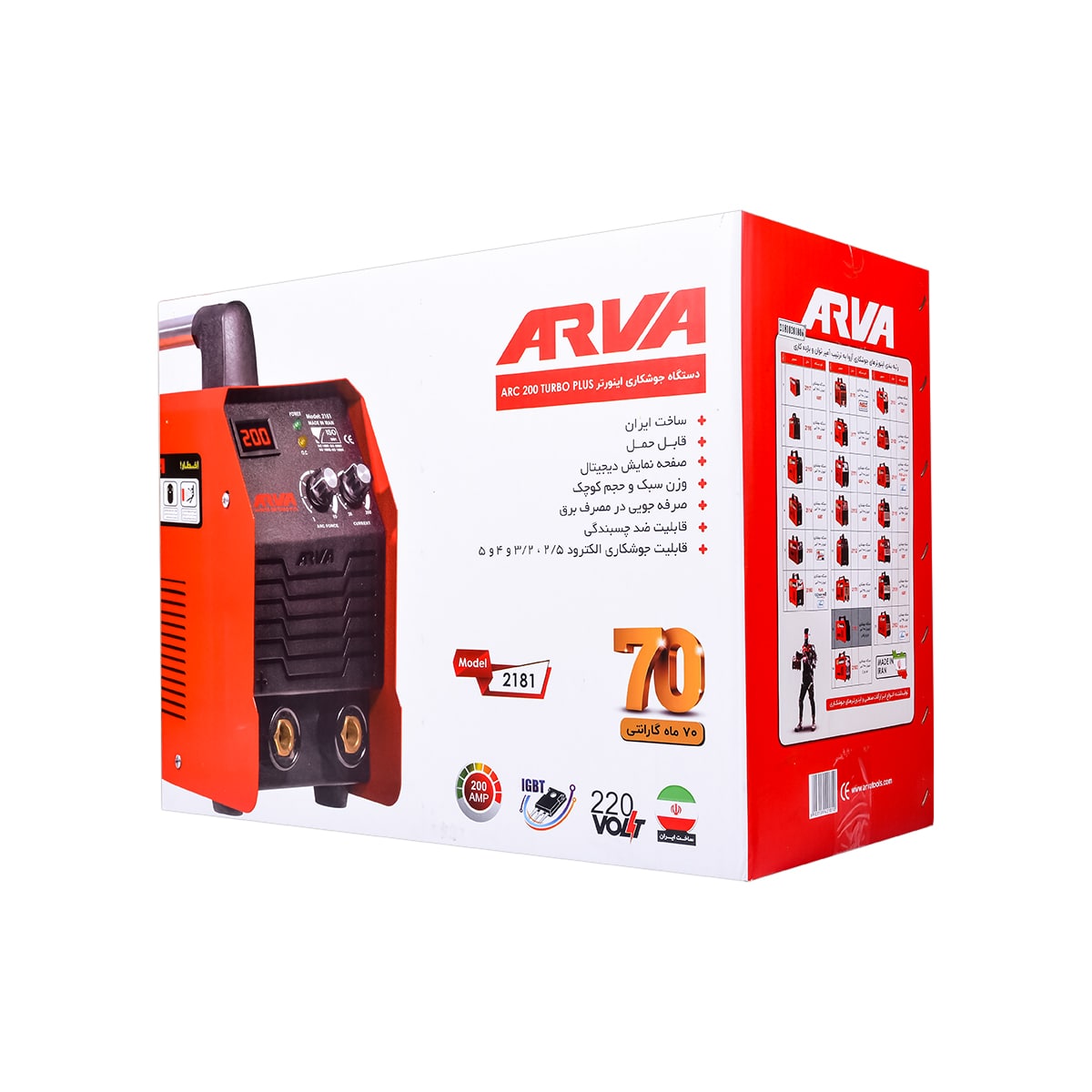 دستگاه جوش ۲۰۰ آمپر آروا مدل ۲۱۸۱ با جریان خروجی ۲۰۰ آمپر، قادر است انواع الکترود های رایج (۲.۵ تا ۵ میلیمتر) را جوشکاری کند و برای کارهای سنگین مناسب است.