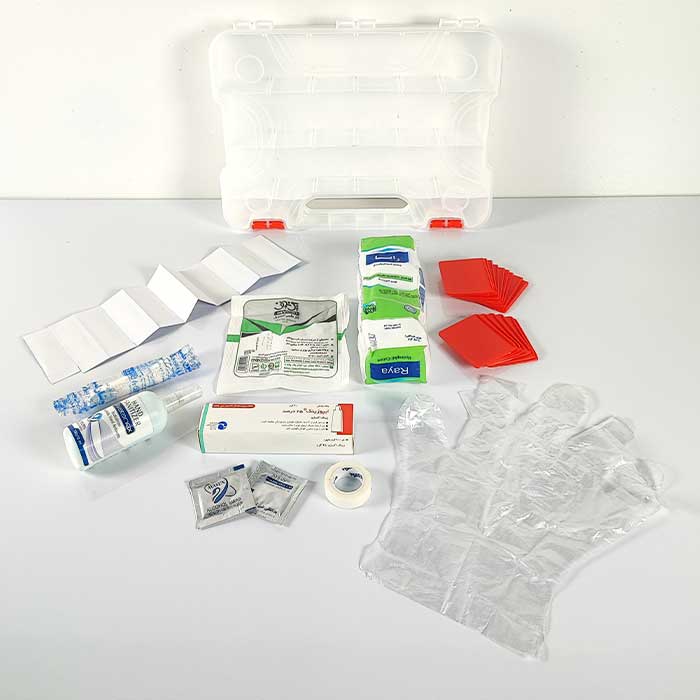 - به همراه یک بسته پنبه، بتادین، چسب زخم، دستکش لاتکس، پد الکی، گاز استریل، باند، پماد و چسب نواری کاغذی