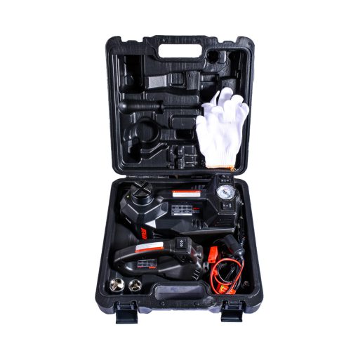 این محصول و کیت 3 کاره شامل جک، پمپ باد و آچار بکس برقی همگی در یک ابزار است.