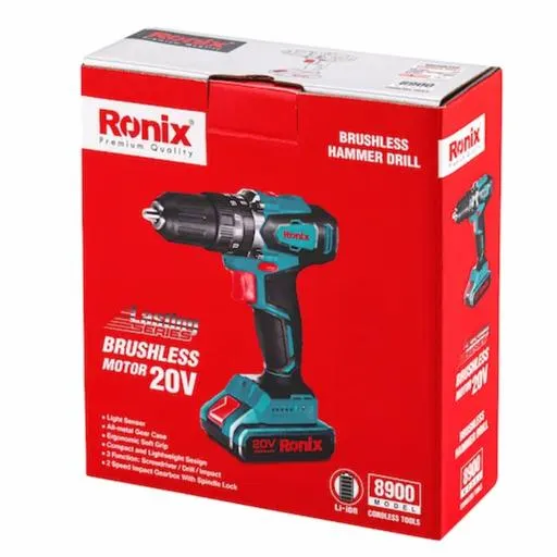 · دریل شارژی 8900 در جعبه رنگی طراحی شده توسط رونیکس عرضه میشود.